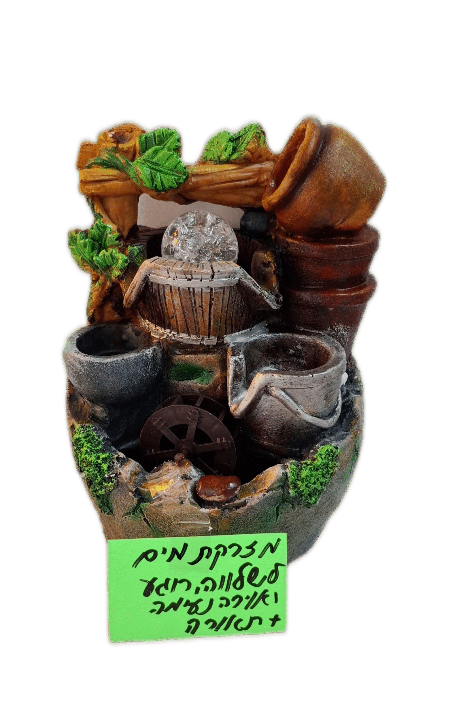 המזרקה פועלת עם משאבת מים חשמלית ונורות צבעוניות המאירות את כדור הקריסטל המסתובב עקב זרימת המים,
